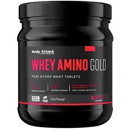 آمینو وی گلد بادی اتک BODY ATTACK WHEY AMINO GOLD یک فرمول پیچیده از آمینه اسیدها است به طوری که از 8 اسید آمینه ضروری و 10 اسید آمینه غیر ضروری تشکیل شده است. وی آمینو گلد یک جایگزین ایده آل برای شیک پروتئینی است زیرا این قرص ها همان اسیدهای آمینه با کیفیت مورد نیاز برای رشد عضلانی بدون چربی را تامین می کنند که به راحتی می توان آن را در هر زمانی در محل کار، در طول سفر یا در راه باشگاه مصرف کرد.